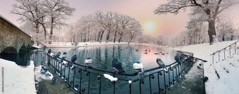 birds on the winter lake in the park