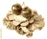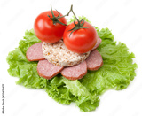 Sandwich with sausage, tomatoes and salad