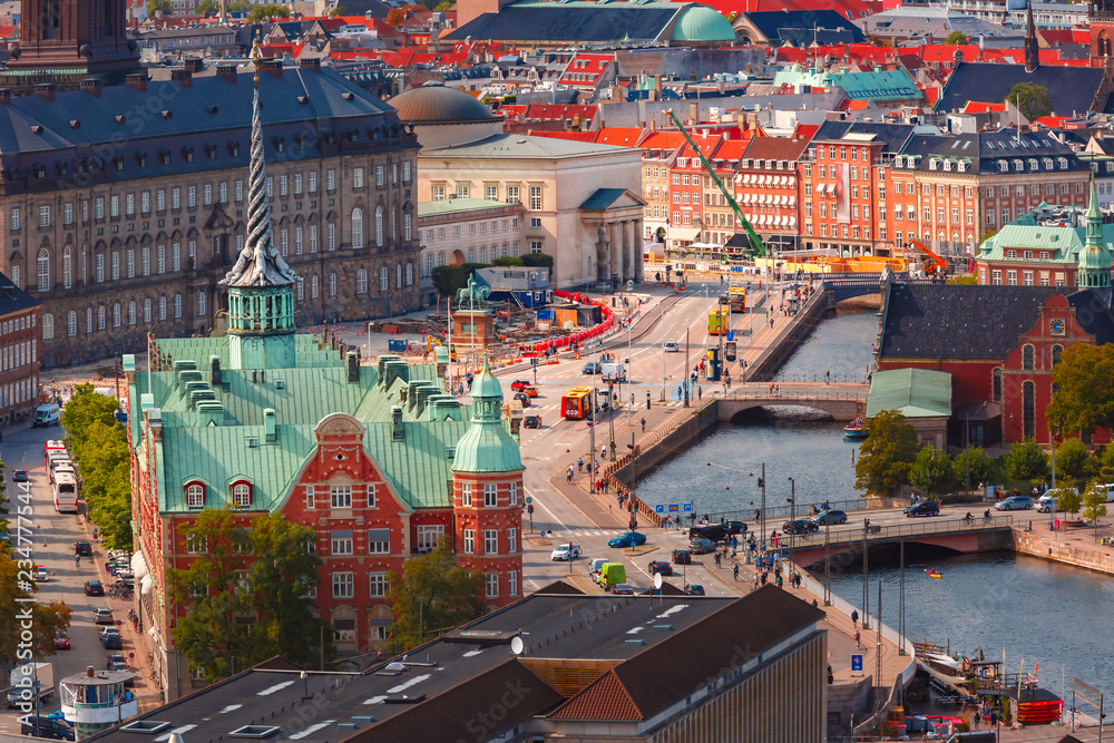 Scenic summer aerial view of Old Town skyline with Boersen and lot of red roofs, Copenhagen, capital of Denmark