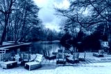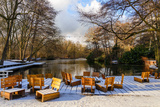 Scenery of frozen lake, snow cover wooden outdoor chairs, seats and deck waterside and forest in winter atmosphere. View from Café am Neuen See inside Tiergarten park in Berlin with sunset light.