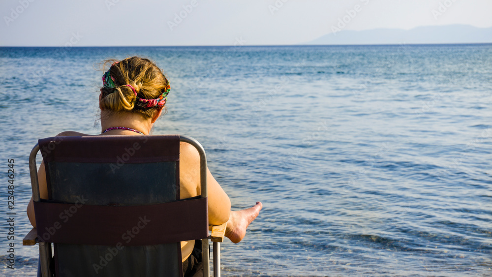 Young woman / girl sitting on chair, reading book towards blue sea water on beach. Relaxation, resting vacations, cultural activity concept. Leisure in summer. Freedom, information, knowledge concept