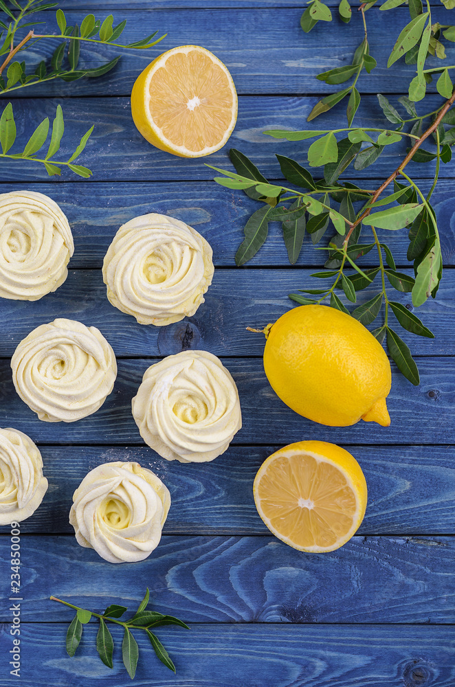 Yellow, apple marshmallow with lemon on a bright blue background.