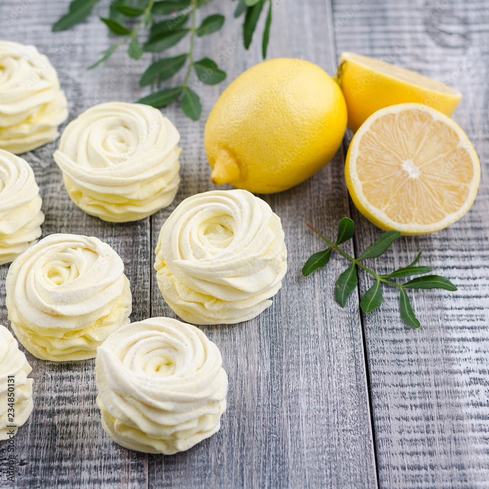 Yellow, apple marshmallow with lemon on wooden vintage background.
