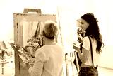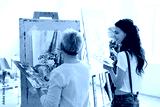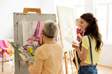 creativity, education and people concept - happy women with brushes and palettes painting still life picture on easel at art school studio