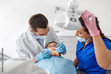 medicine, dentistry and healthcare concept - dentist with mouth mirror and probe checking for kid patient teeth at dental clinic