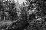 Profile view of young long-haired barefooted tourist girl sitting on huge rock with enjoying fantastic view of mountains covered with pine forest.