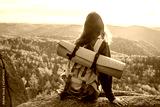 young tourist girl sitting on huge rock with big puddle in the middle under beautiful sunset enjoying fantastic view of mountains covered with pine forest.