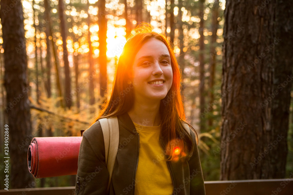 young tourist girl under beautiful sunset enjoying fantastic view of mountains covered with pine forest.