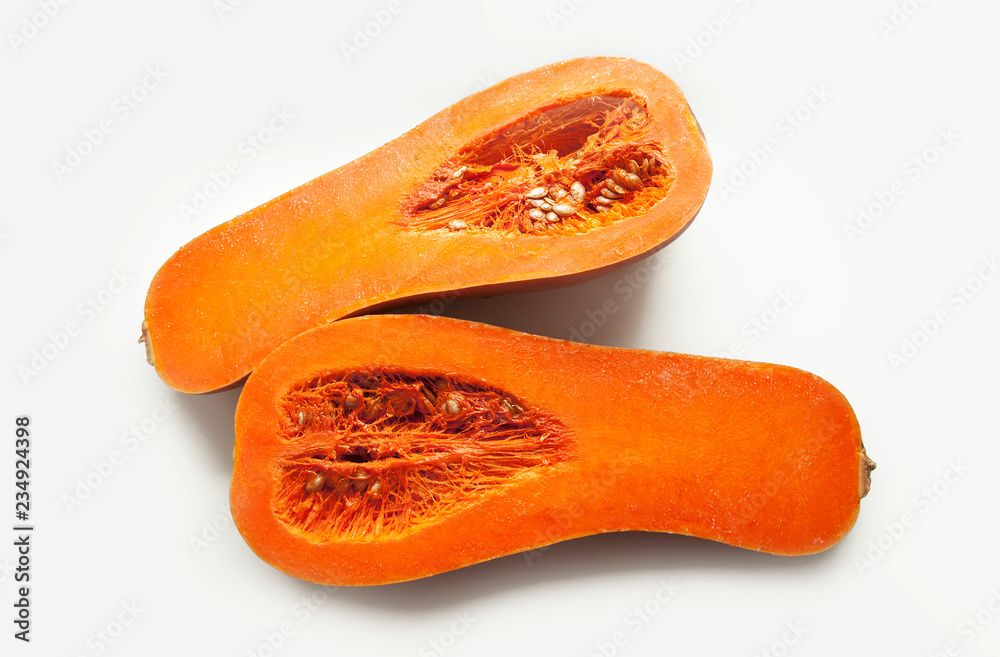 Two halves of ripe butternut squash pumpkin on a white background. Orange pumpkin with a tail. Close-up.
