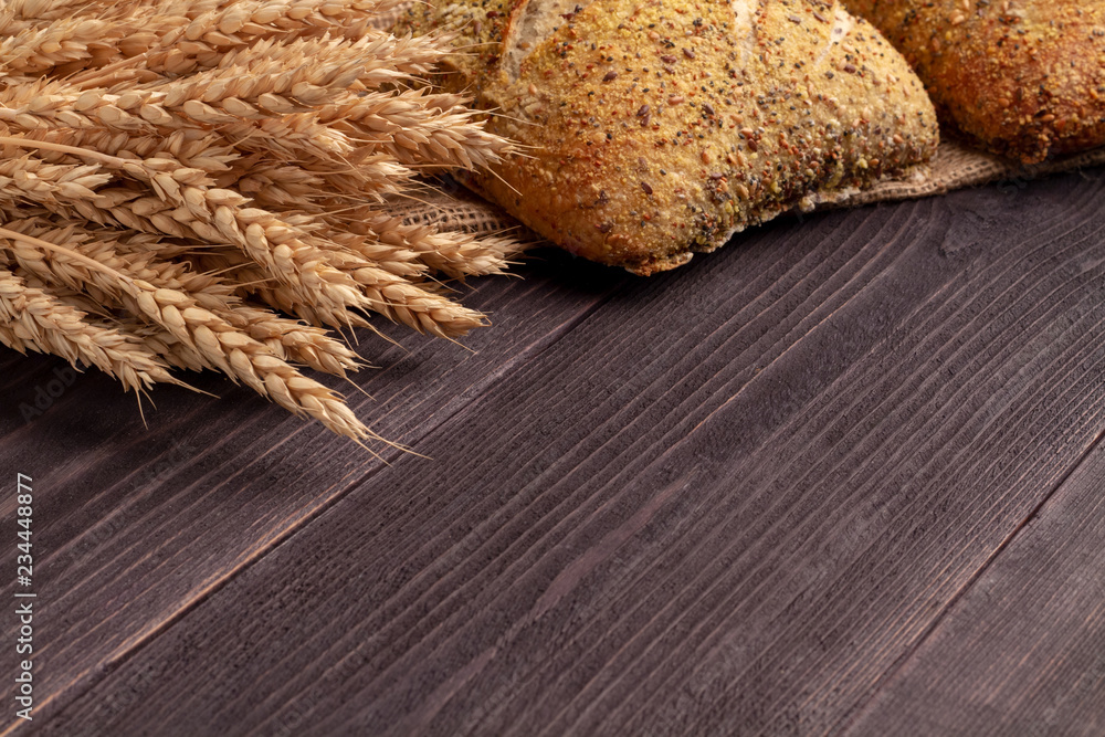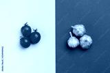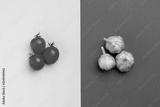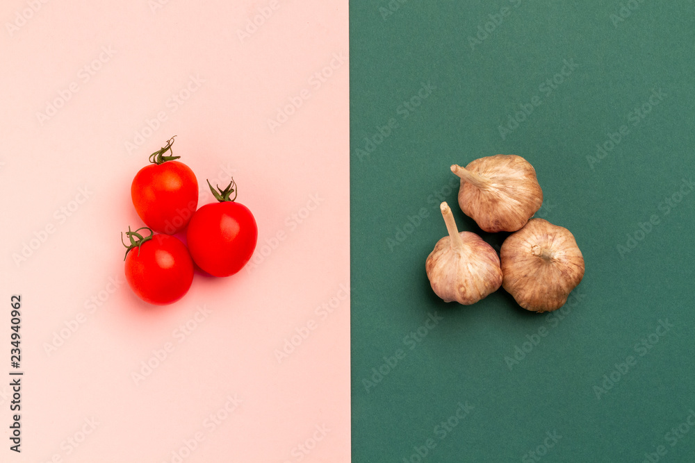 Creative vegetable mock-up on a two-color cardboard: three red tomatoes and dry vitamin garlic. Concept on a textured design cardboard. Template for food production.