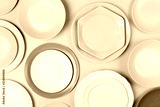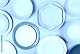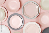 Plates and dishes for serving a festive table on pastel colors background. Flat lay, top view.