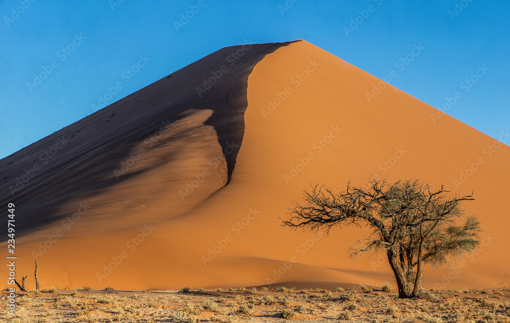 Single tree on the background of a beautiful dune and blue sky. Stunning light and color. Africa. Landscapes of Namibia. Sossusvlei. Namib-Naukluft National Park.