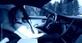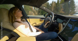 CLOSE UP: Female tourist sleeps while the autonomous car drives her down highway