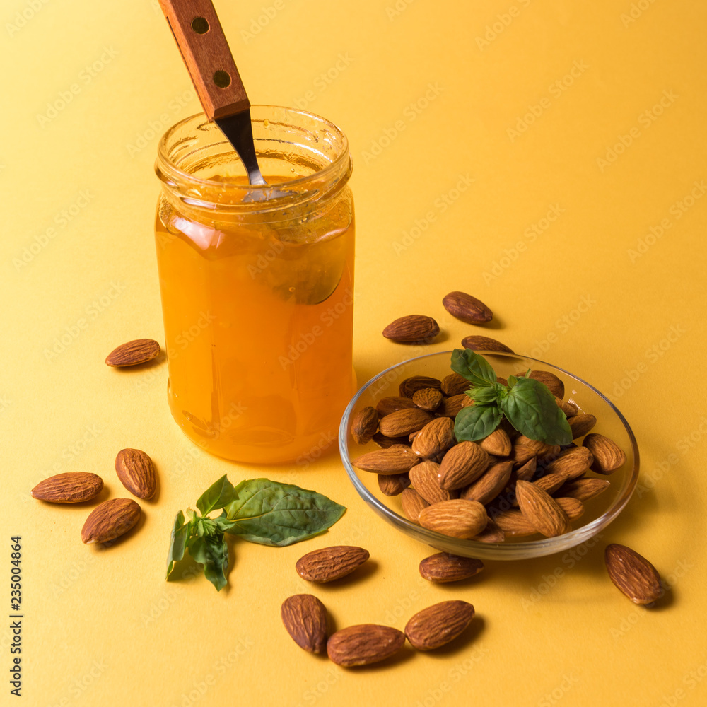 Homemade jam in a glass jar and almond nuts on yellow background.