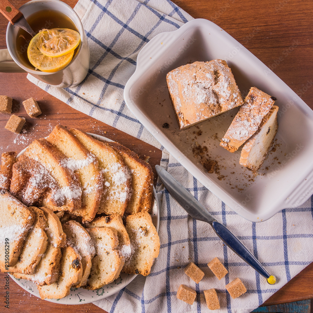 Flat lay view of pieces of homemade cake and a cup of tea with lemon.