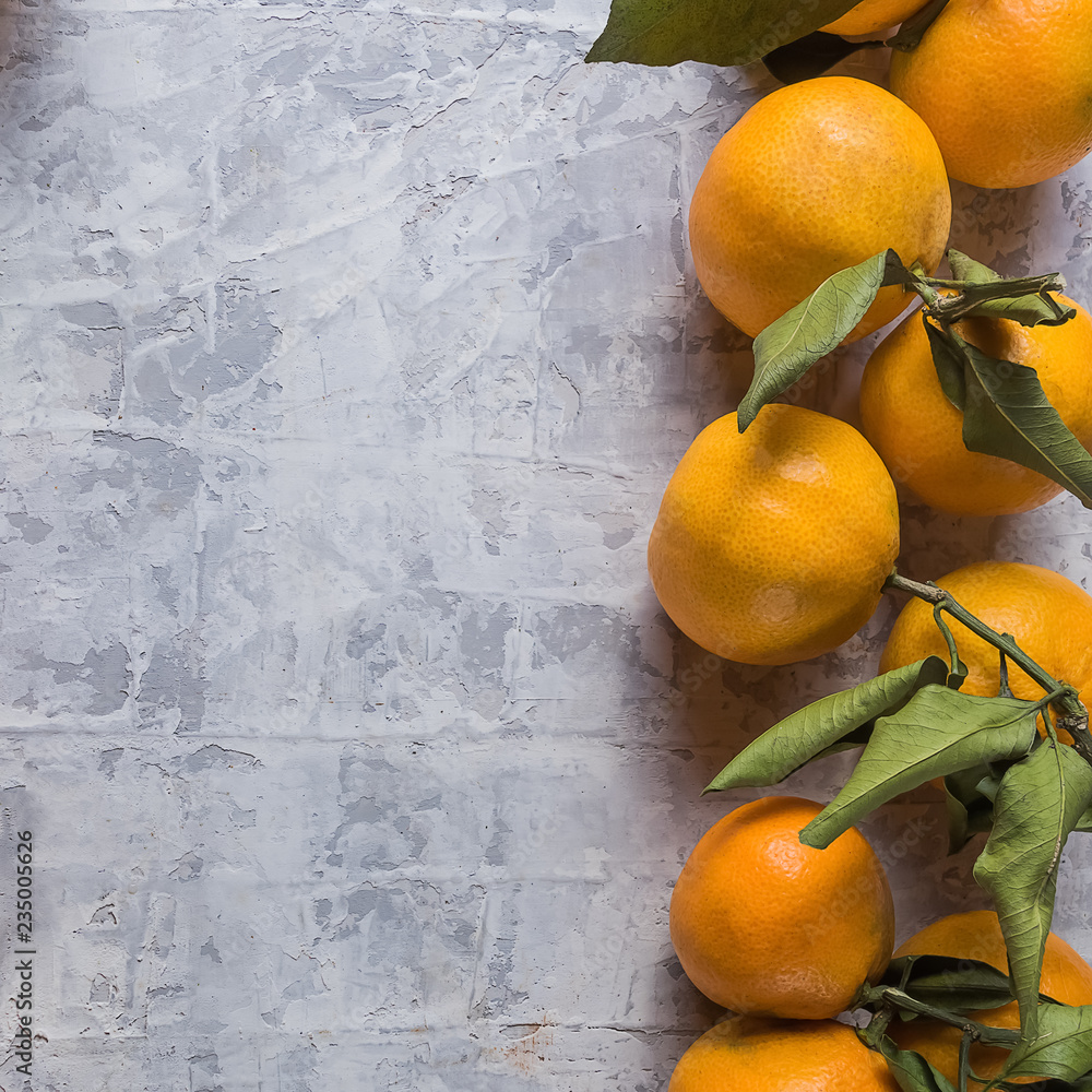 Orange ripe mandarin fruit layout with green leaves over rustic white wooden background.