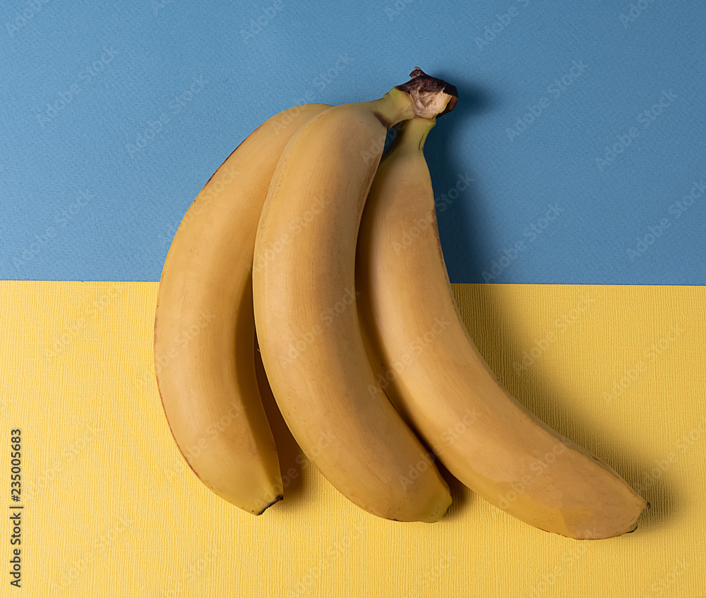 Minimalism style. Fruit pattern with yellow ripe banana fruit over blue background.