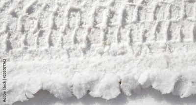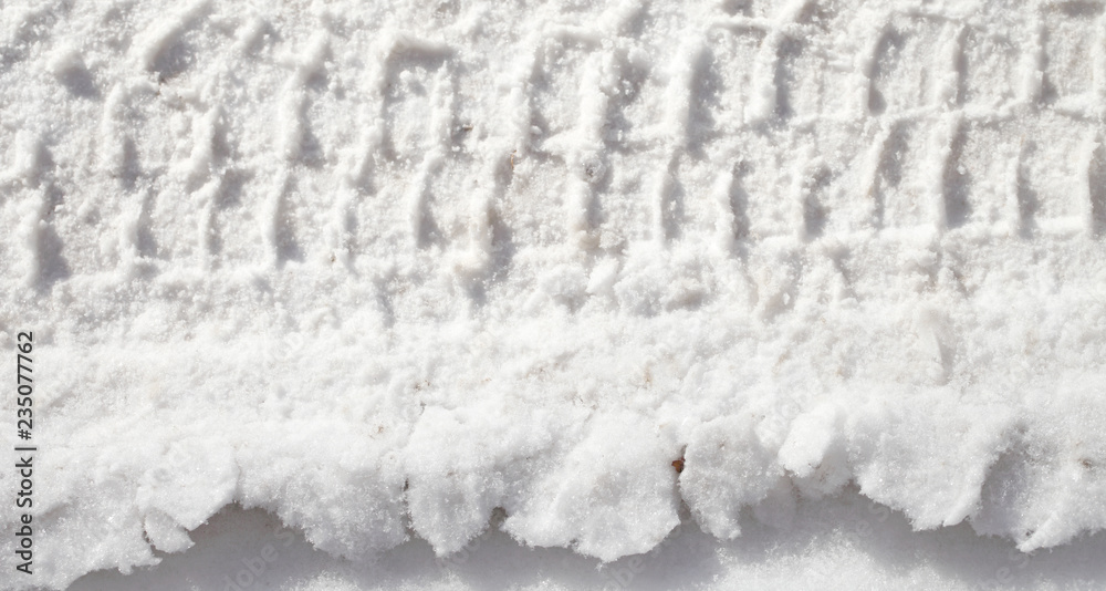 Imprint of the car tire on the snow. A track trace on the road on a winter day.