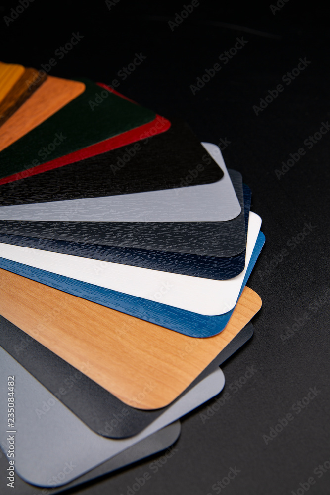 Próbnik, wzornik kolorów. Wzornik kolorów wachlarzyk na ciemnym tle.y bożonarodzeniowe. Świąteczny prezent pięknie zapakowane w dekoracyjne papiery i kokardy.