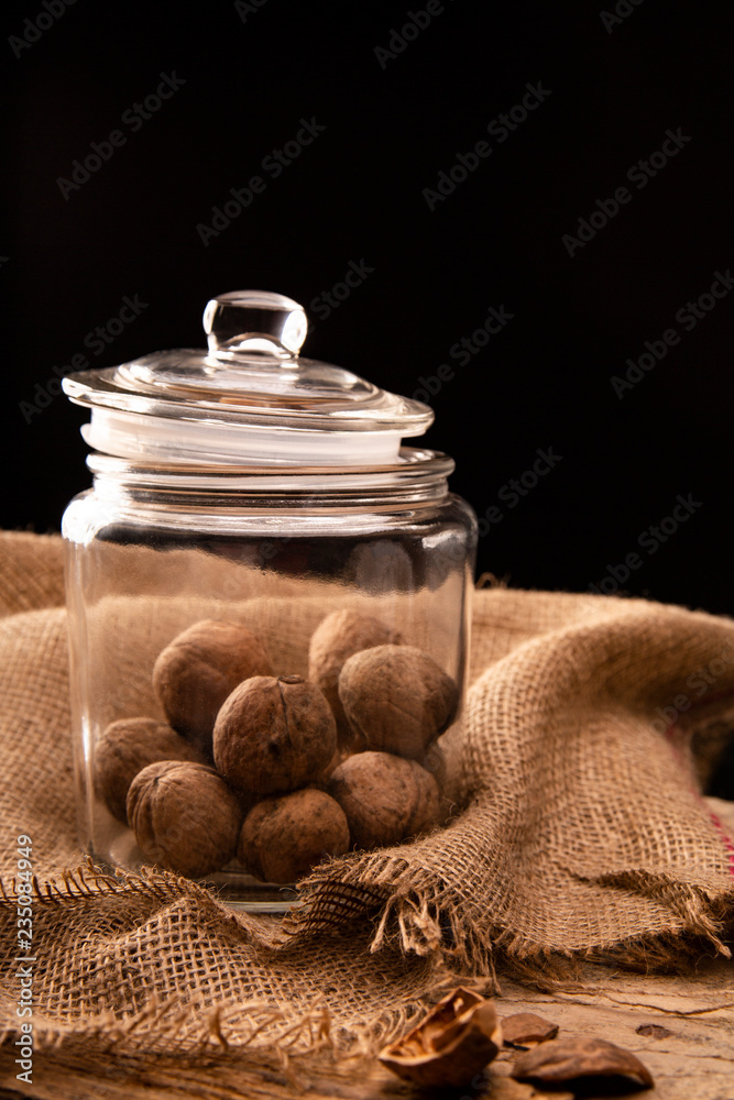 Orzechy włoskie. Słój z orzechami w kompozycji na naturalnym lnianym obrusie i drewnianym stole