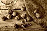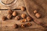 Orzechy włoskie. Słój z orzechami w kompozycji na naturalnym lnianym obrusie i drewnianym stole