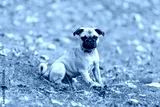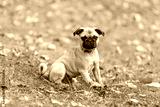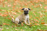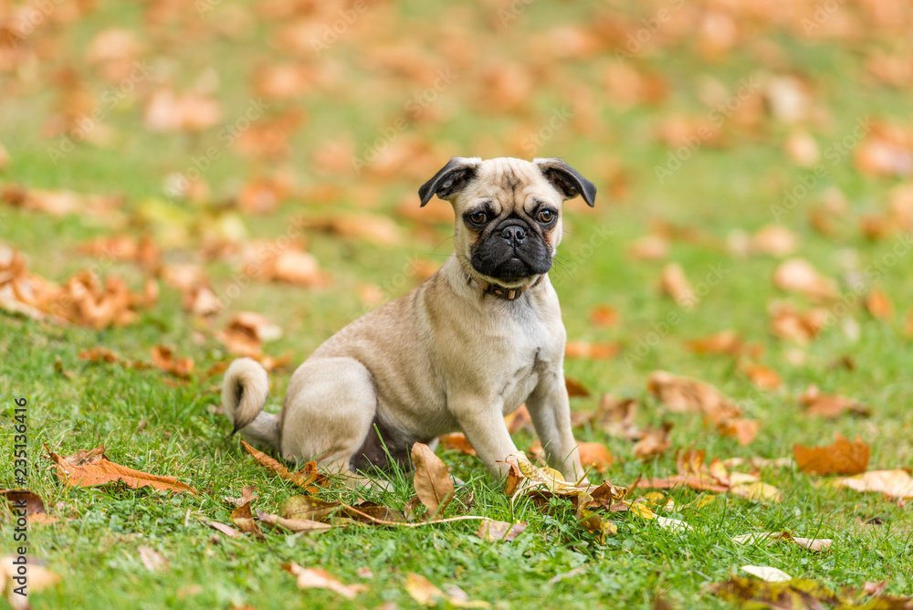 Retro Mops Welpe im Gras sitzend mit braunem Herbstlaub