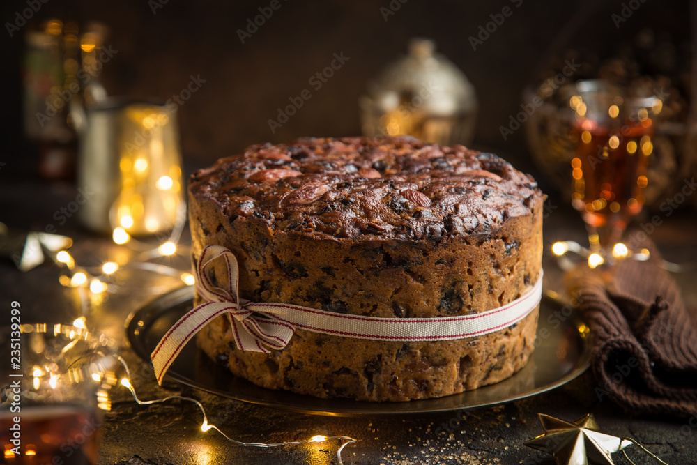 Traditional Christmas fruit cake on dark background