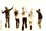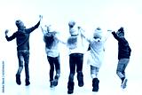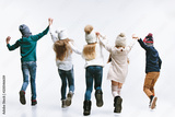The back view of group of kids in bright winter clothes, isolated on white studio. Fashion, childhood, happy emotions concept