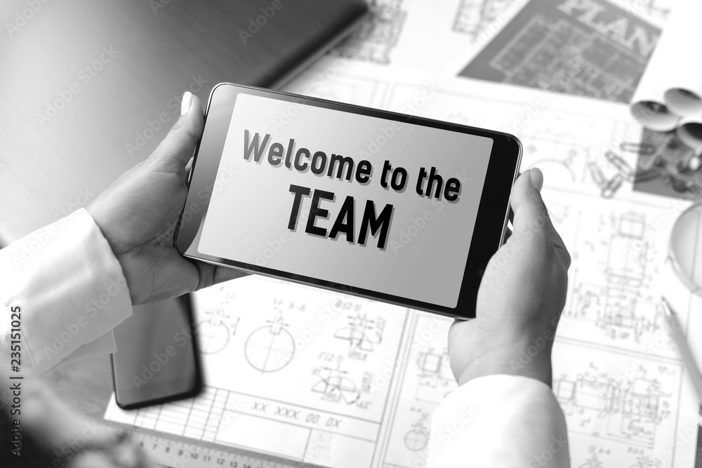 A girl (architect, student, businesswoman) at a table with business accessories, accessories for drawing (plans, rulers) and training with tablet with text Welcome to the team