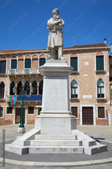 Niccolo Tommaseo statue with pedestal in Venice by Francesco Barzaghi (1839-1892) in a sunny summer day in Italy