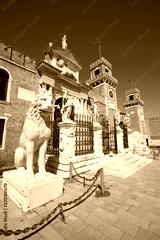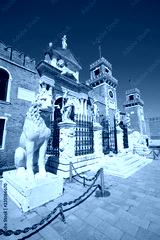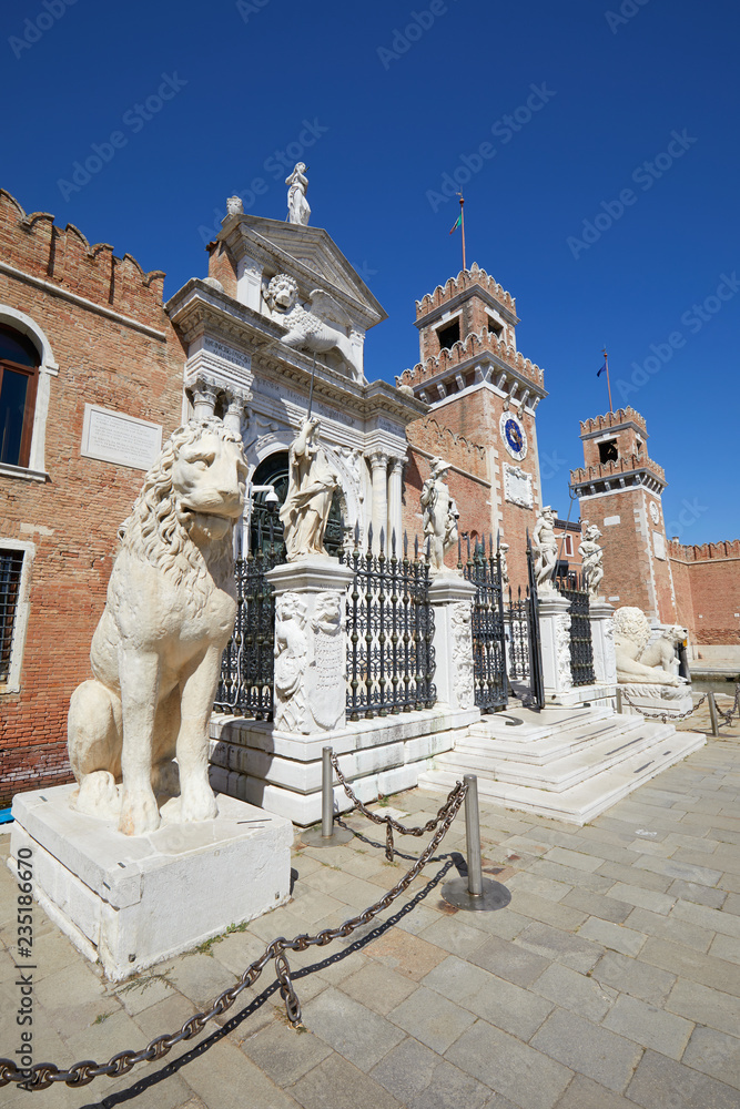 Venetian Arsenal gate and walls with statues in a sunny summer day in Venice, Italy