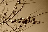 Red bright miniature fruits against blue sky. Red paradise apples. Autumn sunny day.