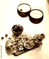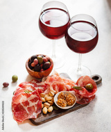 Meat plate, cold smoked pork, jamon, prosciutto, salami served with wine, nuts and olives