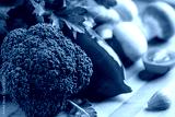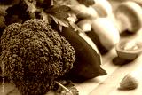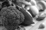 Still life of broccoli, pepper, tomato, champignons, royal champignons, garlic, parsley lies on a wooden kitchen board. Focus on broccoli inflorescence.
