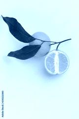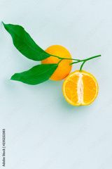 Creative fruit layout: orange branch with two yellow oranges. One orange is cut in half and sparkles with juicy pulp. Concept on a blue textured design cardboard. Template for banner.