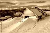 abandoned huts (cabins) in the winter mountains
