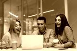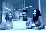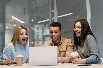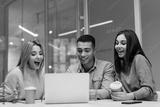 Overjoyed business people with emotional faces celebration success, winning tender. Successful startup project. Group of young happy entrepreneurs working together using laptop computer. Meeting.