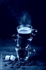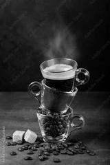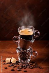 glass cups, in sequence vertically, with coffee beans, ground, and steaming drink. still life