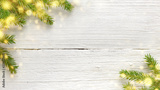 Christmas and New Year white wooden background with fir branches and glowing lights