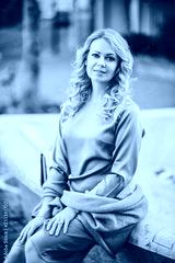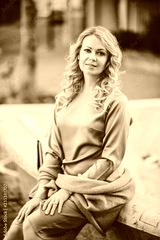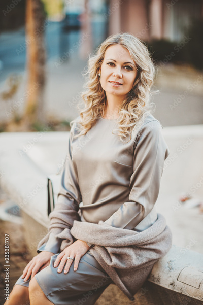 Fashion portrait of beautiful blond woman wearing silk classy dress, posing outdoors