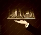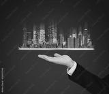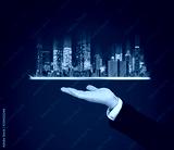 Businessman hand holding digital tablet with modern buildings hologram. Smart city, building technology and real estate business