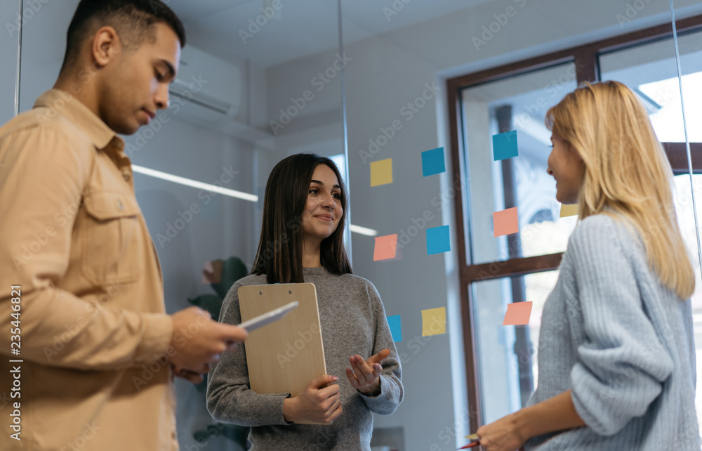 Group of happy multiracial business people working project, planning strategy, talking, discussion creative idea in modern office. Smiling colleagues meeting, collaborate, using sticky notes and scrum