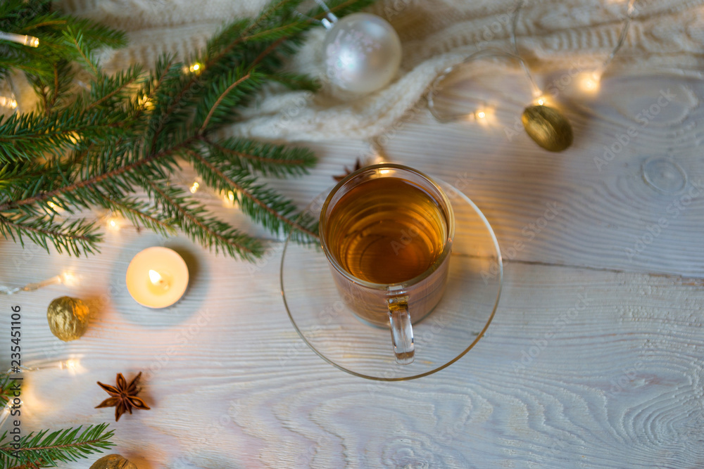 Tea cup, Christmas or new year decoration on modern wooden table.