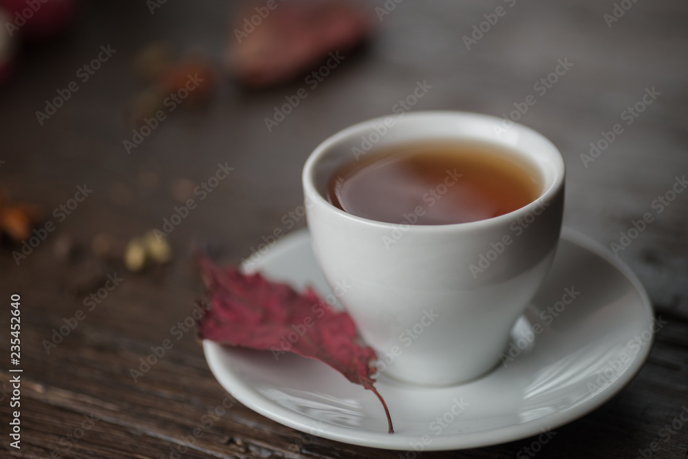 Autumn still life of colorful leaves, a Cup of tea, on an old brown wooden table