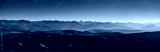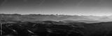Panoramic landscape on Caucasus mountain range covered with snow and valley with yellow grass during autumn sunset
