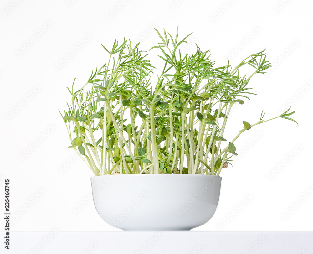 Sweet lupin bean seedlings in white bowl, front view. Young lupini bean plants, sprouted from lupin bean kernels, containing toxic alkaloids. Green sprouts and leafs. Lupinus. Macro photo over white.