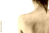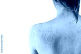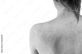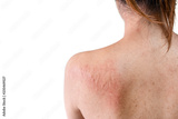 Back of young asian woman have itchy with allergy rash on white background, Selective focus, Health allergy skin care problem.