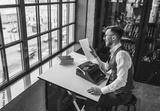 Smiling writer with retro typewriter