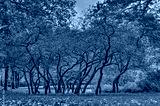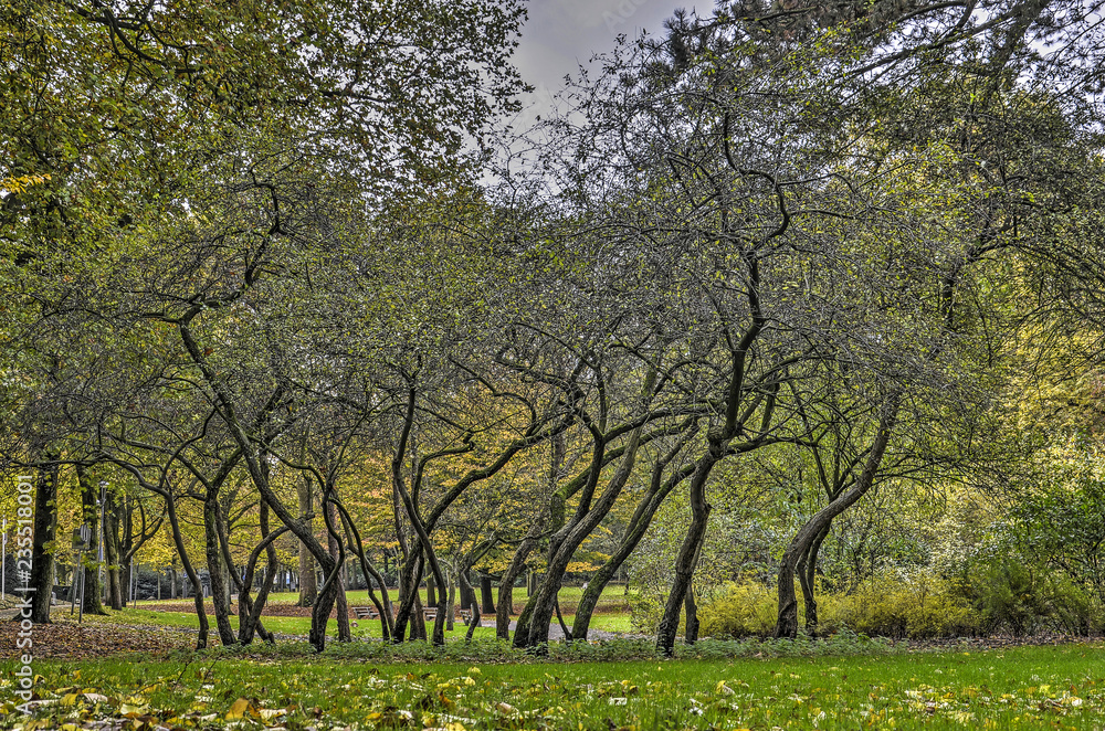Group of small trees, seemingly invloved in a wild dance, in The Park in Rotterdam, The Netherlands in auutmn