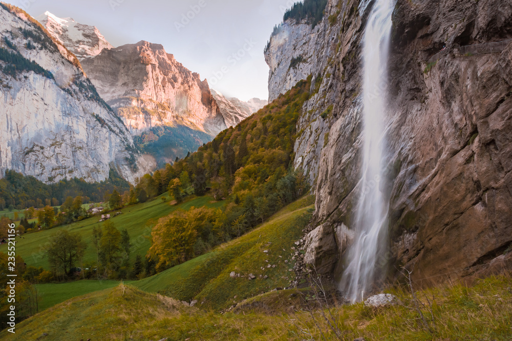 Beautiful alpine landscape in the Lauterbrunnen valley, Switzerland , autumn.